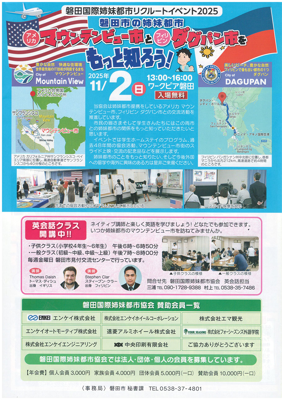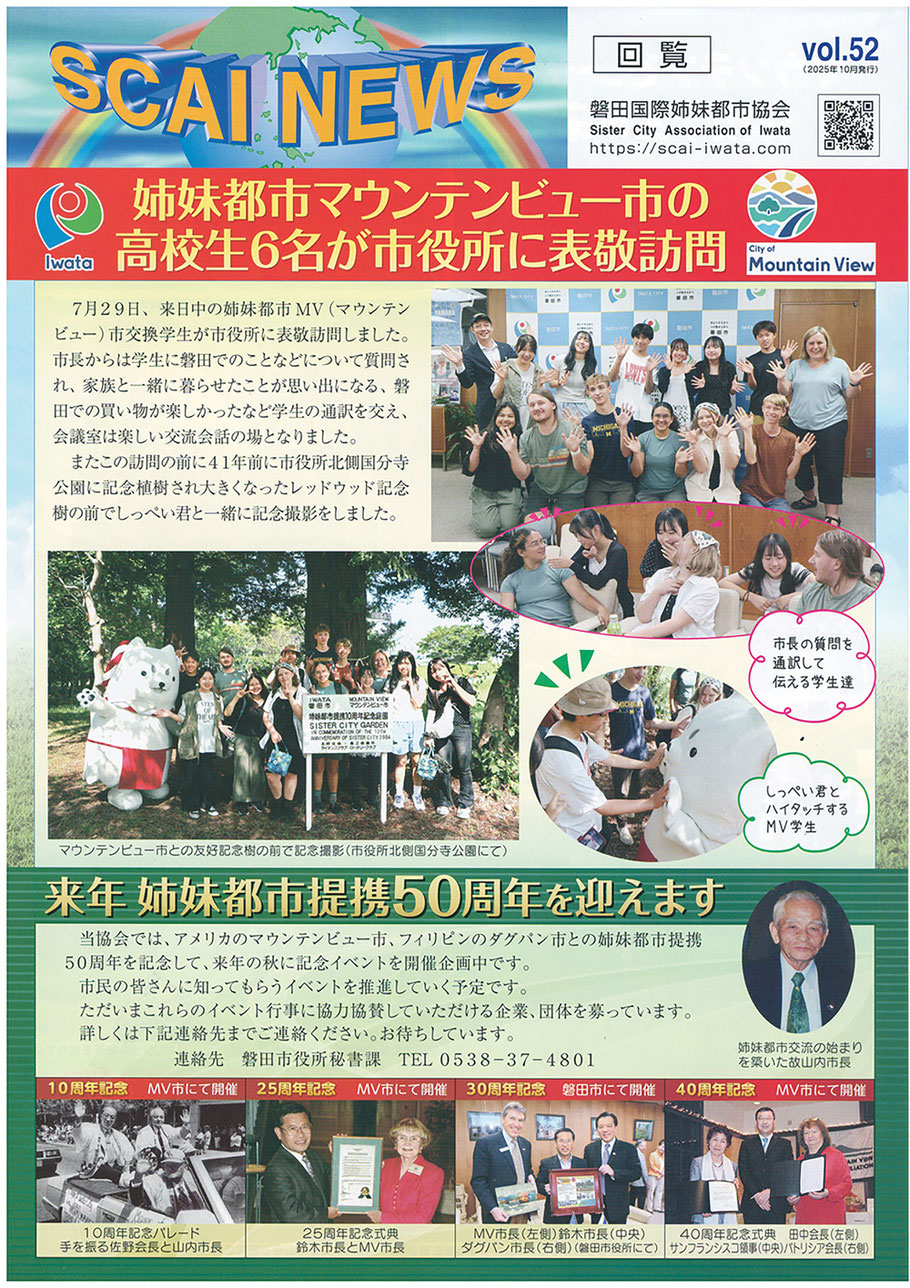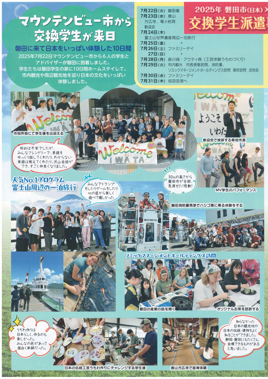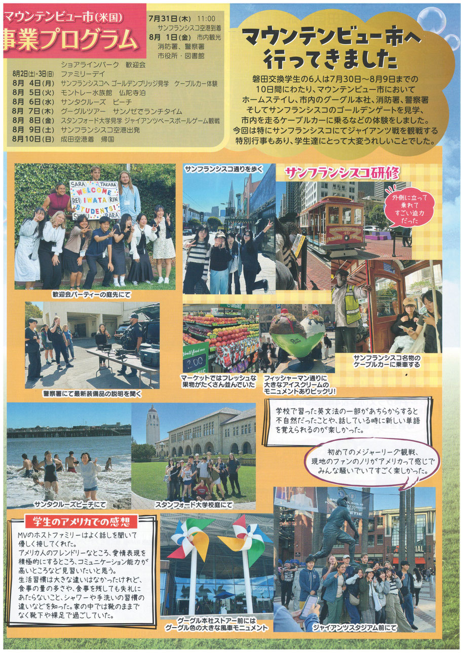 トピックとして今年7月から8月にかけてのマウンテンビュー市と磐田市の高校生の交流交換事業が20日間、行われました。