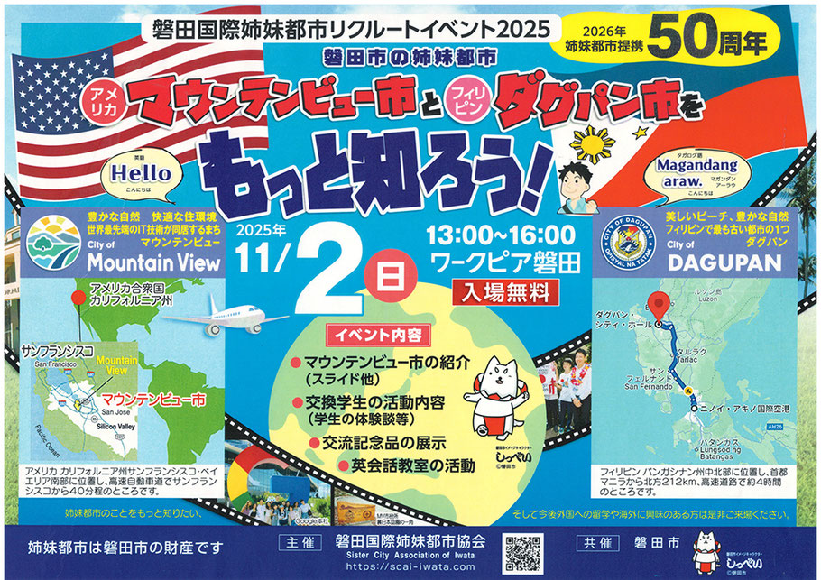 国際姉妹都市のマウンテンビュー市とダグバン市についてもっと知ってもらうために両市との関係や関りについてのイベントを開催します。