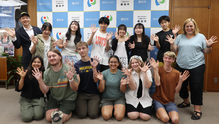 7月22日、マウンテンビュー交換学生6人とアドバイザーが磐田市に到着、磐田市役所前にて草地市長他、受け入れる学生達とその家族が出迎えて歓迎しました。